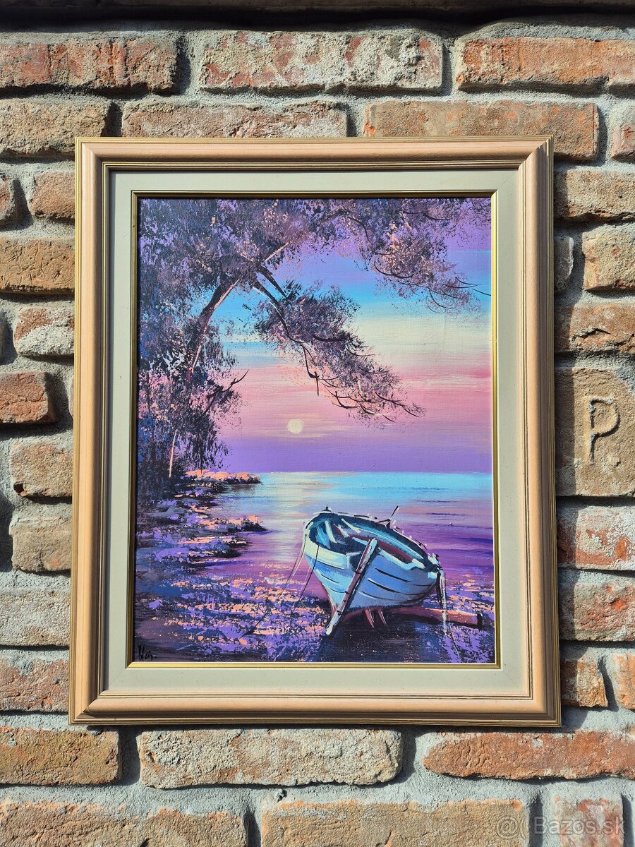 Platno,zatisie na mori s lodkou- olej na platne, Chorvatsko