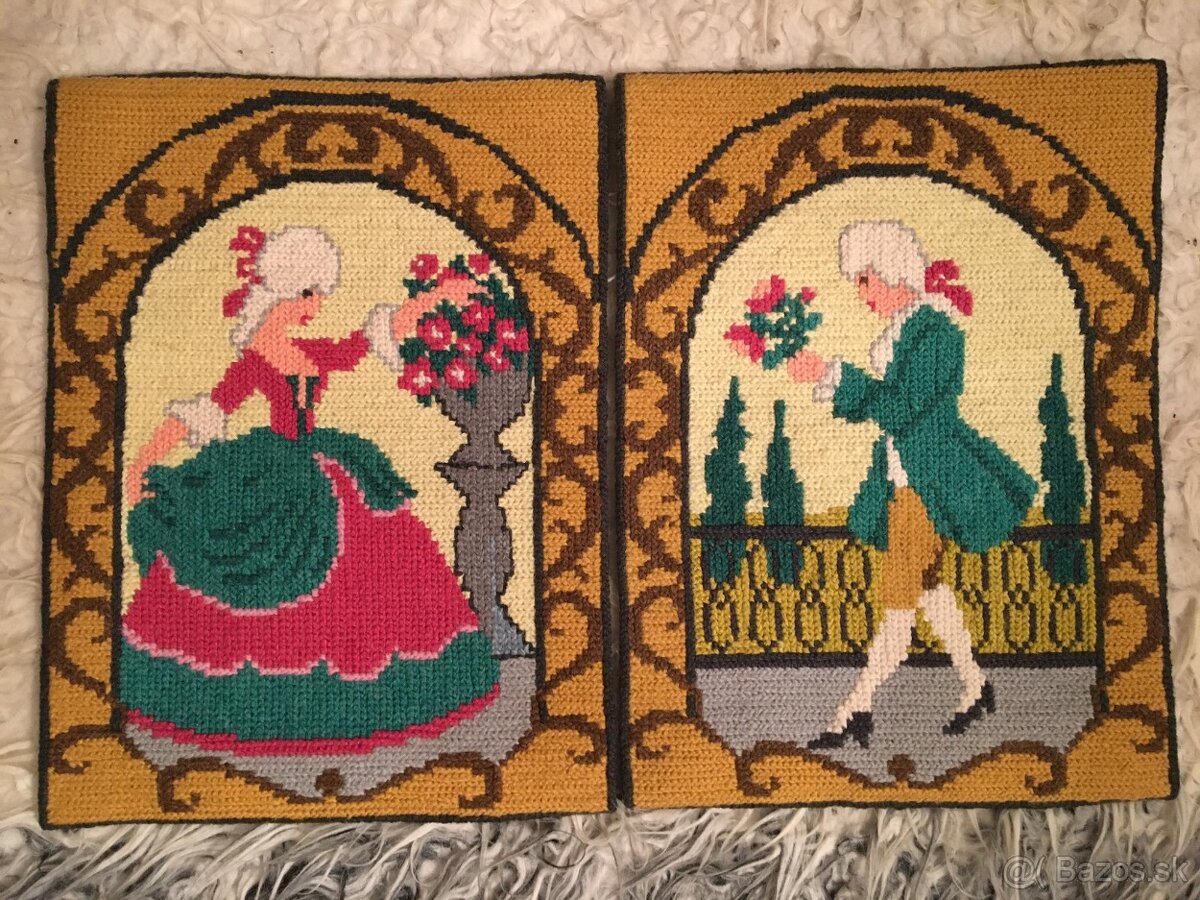 séria dvoch vyšívaných obrázkov, pevných, precízne podšitých., hore 5 cm tunel na prípadný záves na drevenú paličku ;)