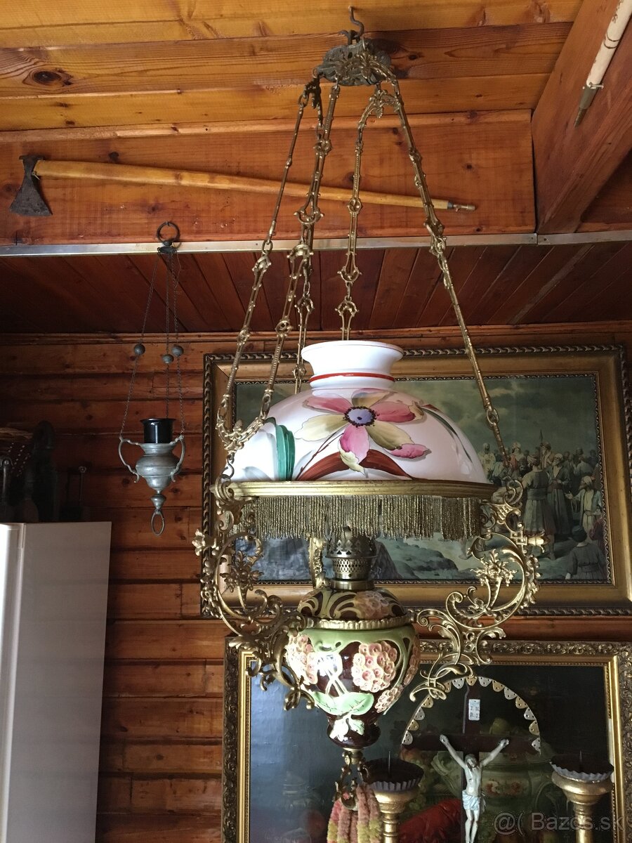 Predam petrolejovy luster,rucne malovany sirm,spodna cest majolika,komplet,neposkodeny,info 0905476740,pozri aj ostatne moje inzeraty