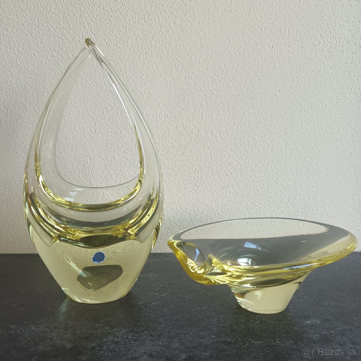 ,výška 23cm a popolník z kvalitného hutného skla českoslov.výroby.dizajnér M.Klinger,krásnej citrínovej farby,v bezchybnnom vitrínovom stave,cena za set spolu 35eur.Možnosť priviesť smer MT-Nové Mesto nad Váhom, BA,príp.poslať poštou alebo.packetou