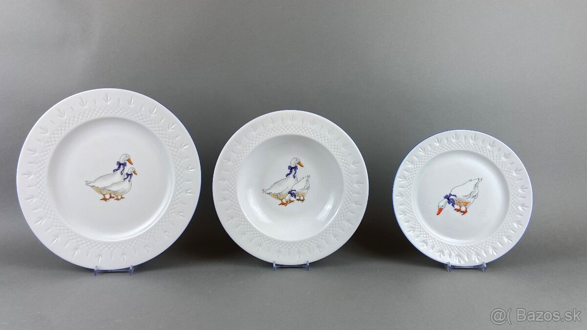 Na predaj niekoľko sád porcelánu s husou, zdobené modrou linkou.