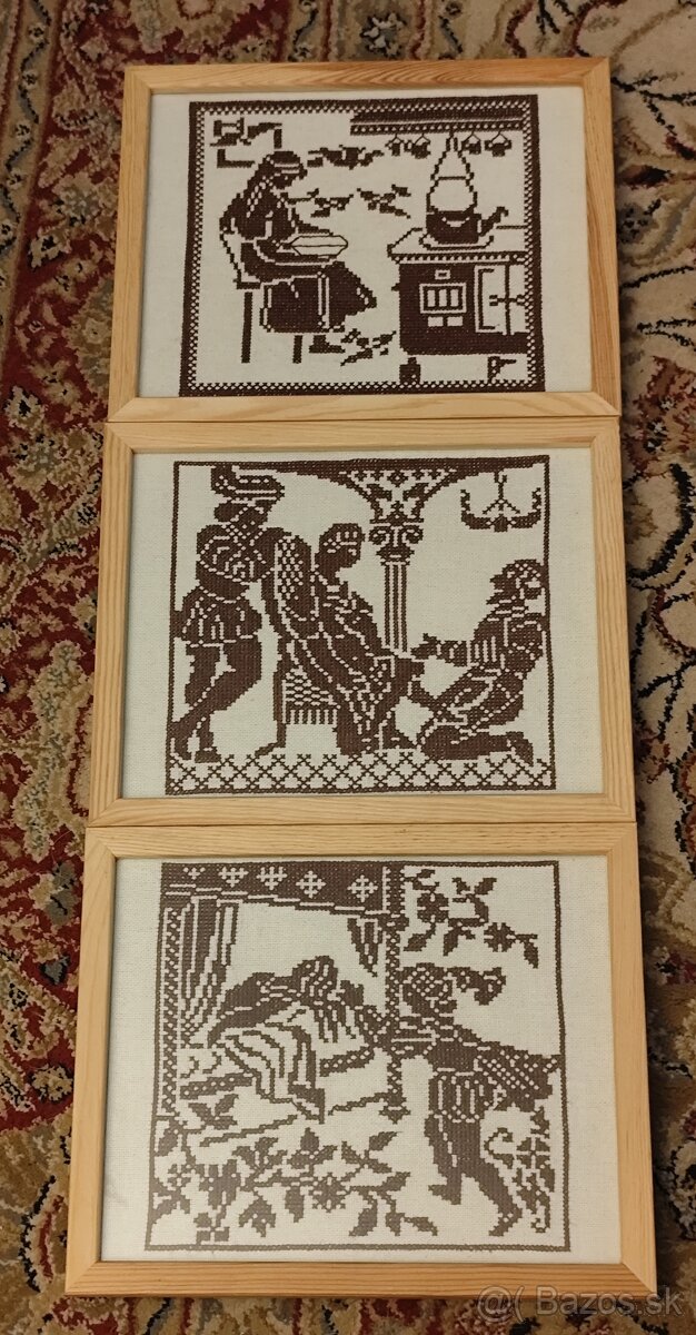 Predám tri mnou vyšívané obrazy. Obrazy sú nové, v rámoch so sklom. Rozmery jedného rámu sú: 27 x 22cm.