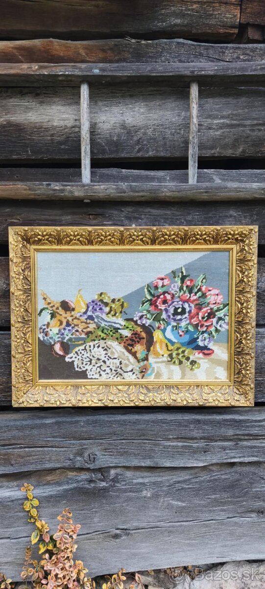 Starý vyšívaný obraz v zlatom ráme. Rozmer 78x58cm.