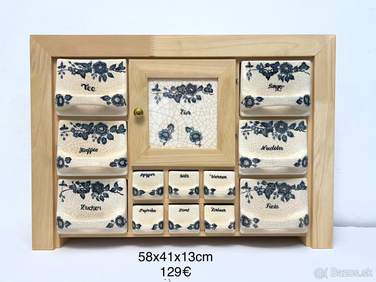 Tento nádherný vintage drevený koreninový stojan s modrými keramickými zásuvkami vyžaruje čistý šarm a triedu. Štýlové spojenie funkčnosti a dekorácie, ktoré sa dokonale hodí do vidieckeho, romantického alebo klasickéj kuchyne.Je to nove a vyrobene v Holandsku, skrinka je zabudovatelna alebo už podľa vášej predstavy.