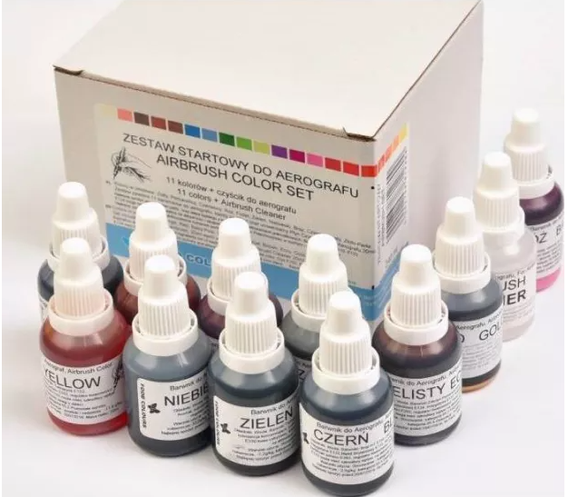 Farby určené predovšetkým na povrchové farbenie tort poťahovaných aj krémových. Môžete s nimi farbiť aj smotanu, pečivo, zmrzlinu, nápoje, džúsy, ovocné náplne, marmelády atď. Vhodné na všetky suroviny obsahujúce vodu. Perleťový vzhľad docielite iba nástrekom na povrch. Súprava obsahuje 1 čistič a 11 farieb (po 20 ml): Yellow (žltá), Orange (oranžová), Red (červená), Baby Pink (ružová), Violet (fialová), Green (zelená), Blue (modrá), Brown (hnedá), Ecru (telová), Black (čierna) a Gold Pearl (zlatá). Výhody farbenia airbrush farbami: - Vďaka pridanému ethanolu, ktorý sa odparí, rýchlo schnú. - Farby sú vysoko koncentrované. - Môžete použiť ako klasické potravinárske farbivo. Na získanie svetlejšieho odtieňa zrieďte bielobou. Perleťové odtiene priebežne dôkladne pretrepávajte. Farby aplikujte z minimálnej vzdialenosti 15 cm vo veľmi tenkej vrstve. Postupne vrstvy pridávajte až docielite požadovaný odtieň. Pri aplikácii tortu umiestnite na otočnú podložku, ktorú pri striekaní otáčajte. Farby bez perlete môžete ľubovoľne kombinovať s farbami perleťovými. Farby obsahujú alkohol, ktorý zvyšuje rýchlosť zasychania a zvyšuje priľnavosť k mastným povrchom.