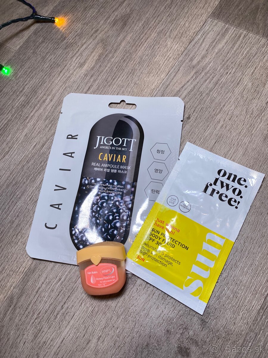 Darčekový set obsahuje pleťovú masku, balzam na pery (vazelína) a krém s SPF.