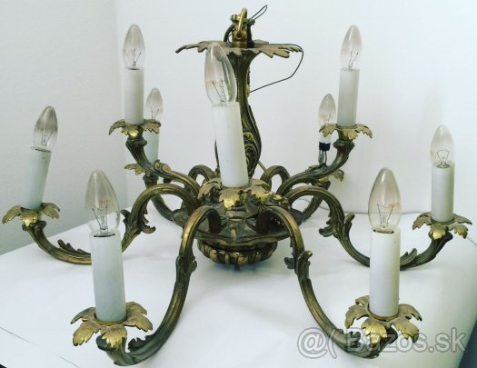 Veľmi starý, starožitný, mosadzný 9ramenný luster na strop závesný, kupovaný ešte za socializmu. Výška cca 80 cm, priemer cca 65 cm. Plne funkčný.