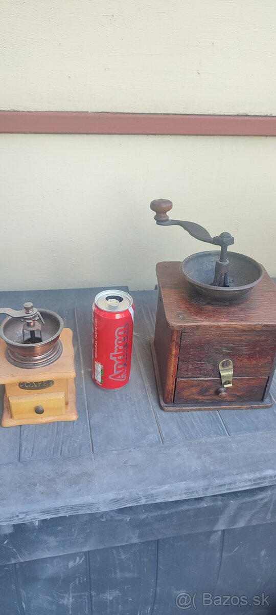 Starý drevený veľký mlynček, jedinečný kus , na porovnanie vľavo klasická veľkosť, rozmery 17x17cm, výška 27cm, po trase Bratislava-Nové Mesto nad Váhom priveziem po dohode