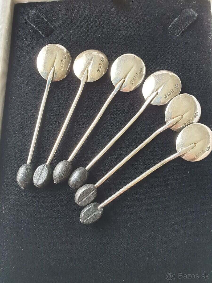 Predam starozitne strieborne lyzicky 6 ks s kavovym zrnkom na konci. Vaha 36 gr. Puncovanie,anglicke punce. rok vyr. cca 1927 bez kazety. Rydzost 925/1000.