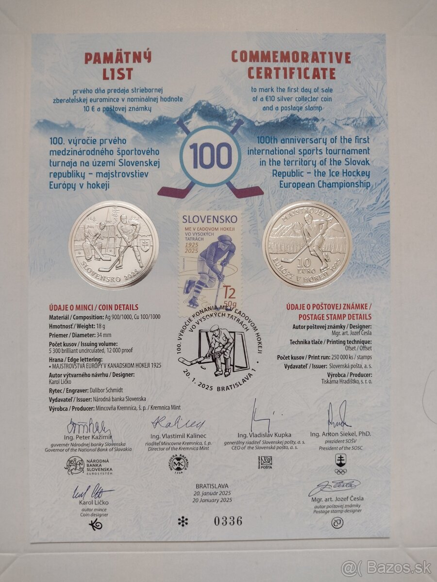 Predám pamätný list k 10€ minci Prvý medzinárodný športový turnaj na území SR - Majstrovstvá Európy v hokeji - 100.výročie