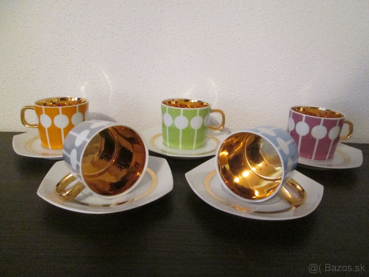 Predám retro farebnú kávovú súpravu od Jaroslava Ježka z karlovarského porcelánu závod Lubenec, r.1967. Súprava je pre 5osôb, nepoužitá, výška šálky 5,5cm vnútro šálky zlatené. 100% stav. viem doručiť do Ba,alebo dobierka.