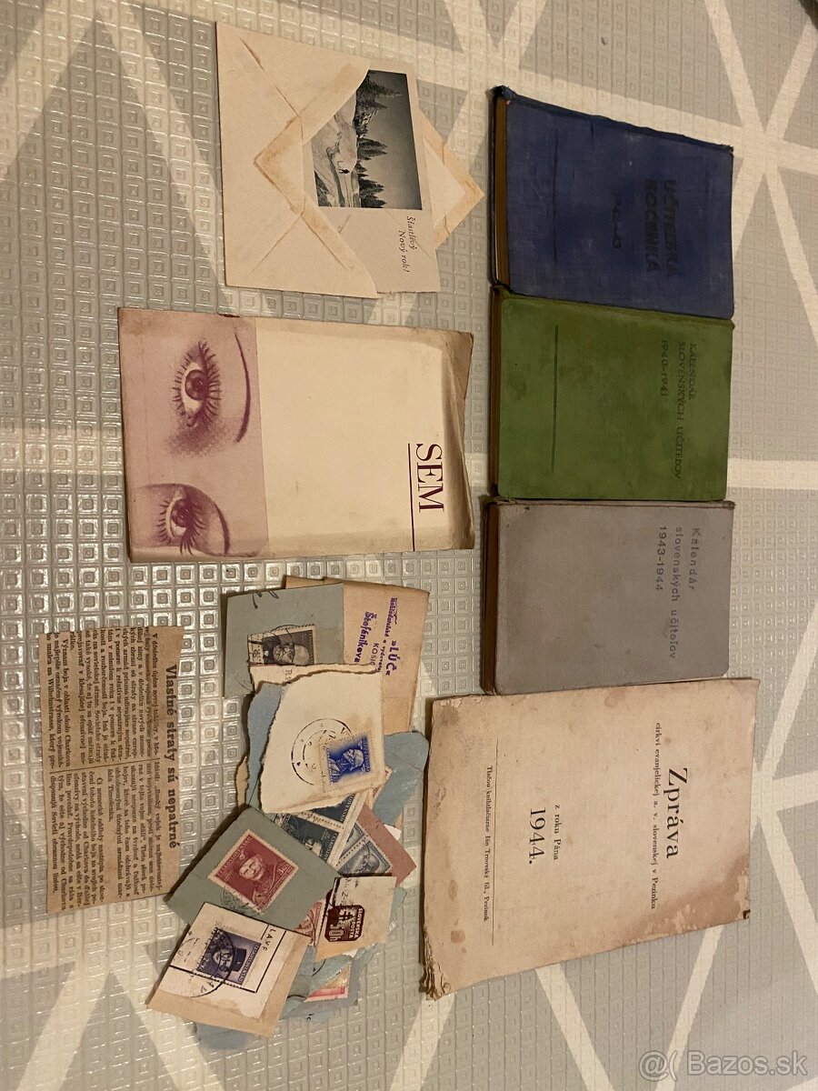 Predam to co je na foto zo slovenskeho statu.Kalendar slovenskym ucitelov 1940-1941 ,kalendar slovenskych ucitelov 1943-1944, Učitelska rocenka 1942-1943. A Zprava cirkvi evanjelickej v pezinku.Ostatne vedla toho boli zalozky v tych kalendaroch. To pridavam k tomu. Je tam vela znamok a rozne vystrizky z novin . A pohladnica Stastlivy novy rok. Predavam len vsetko spolu.