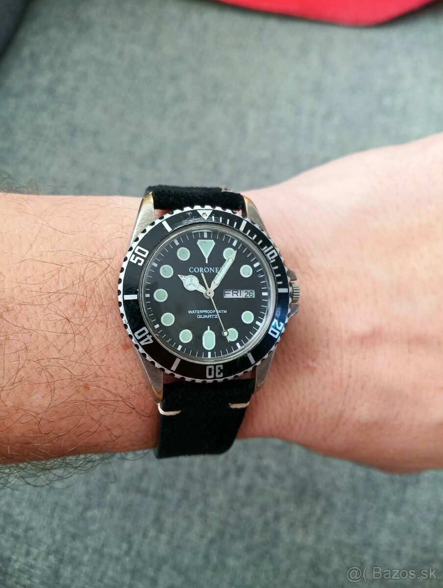 Predám staré retro vintage hodinky zn. Coronet, quartzový strojček, otočná luneta, dátum, iluminácia v tme. Majú známky používania, ale sú plne funkčné, dni aj dátum sa preklápajú správne. Majú novú batériu a pekný remienok z brúsenej kože. Cena je pevná 10 EUR.