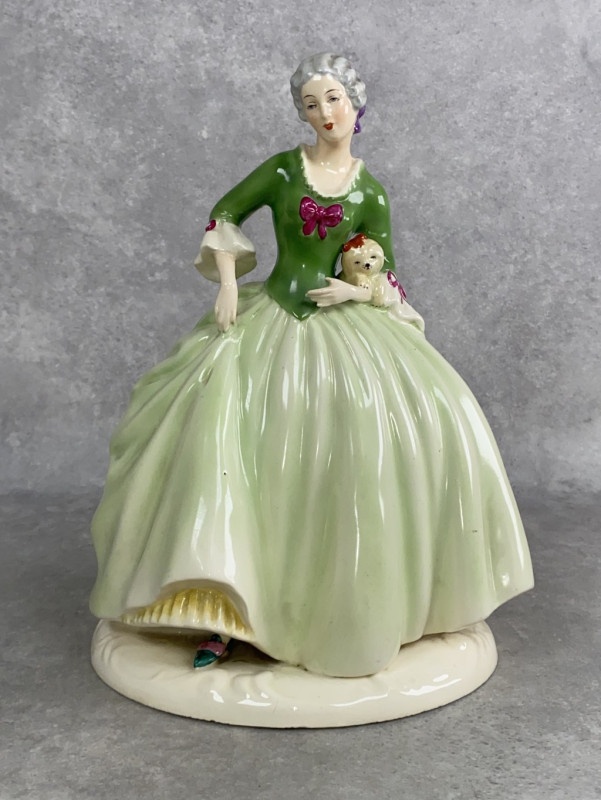 Dáma v zelenej sukni so psíkom Elly Strobach Royal Dux model vyrobený podľa značenia v období 1918-20
