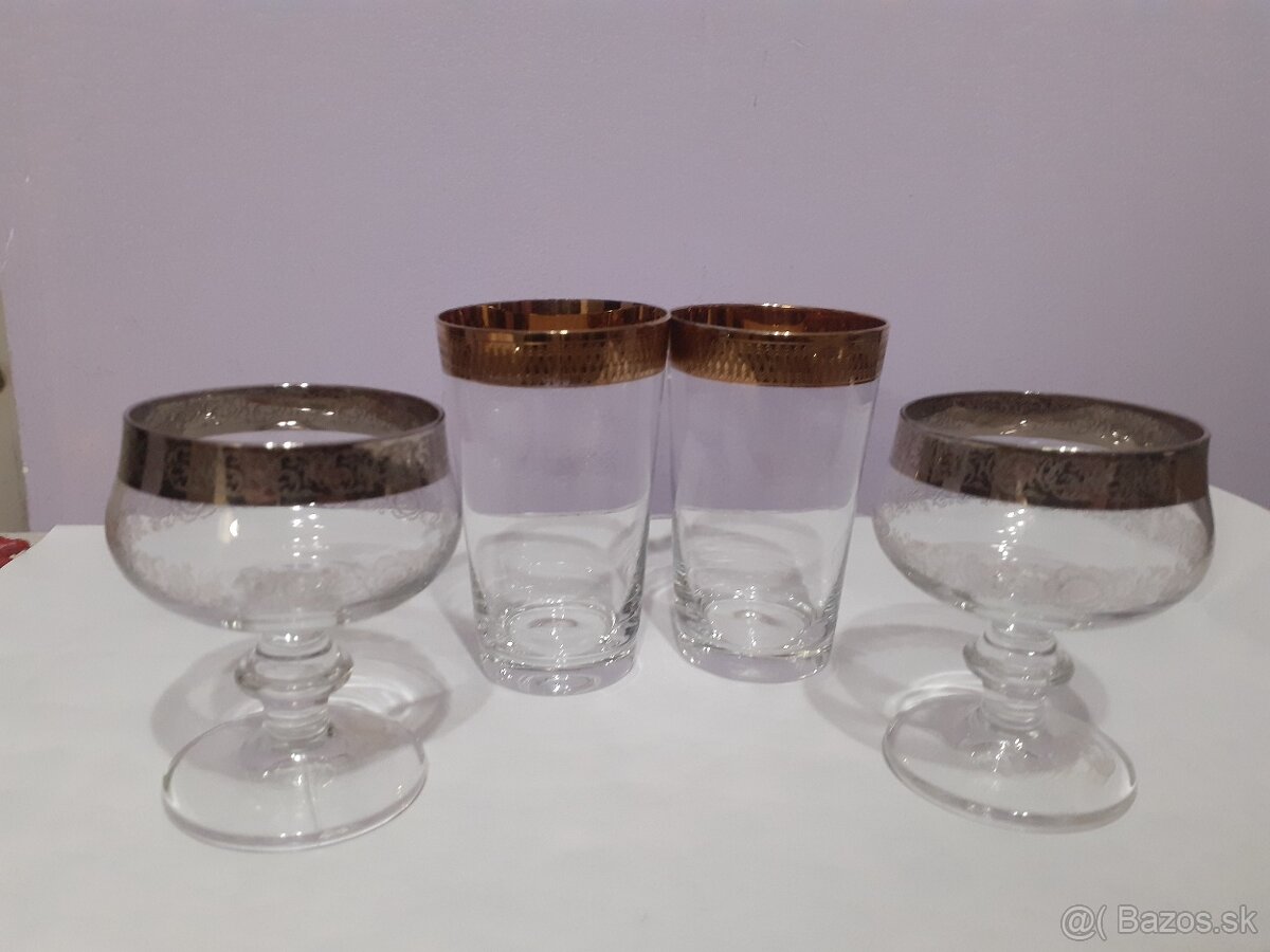 Krásne sklenené poháriky, 2 ks so zlatou obrubou - výška 8,5 cm; 2 ks na stopke s gravírovanou vzorkou a platinovou obrubou - výška 7,5 cm, cena za 1 ks 3,-eur, za vsetky 4 ks spolu 10,- eur + postovne alebo osobny odber v Bratislave