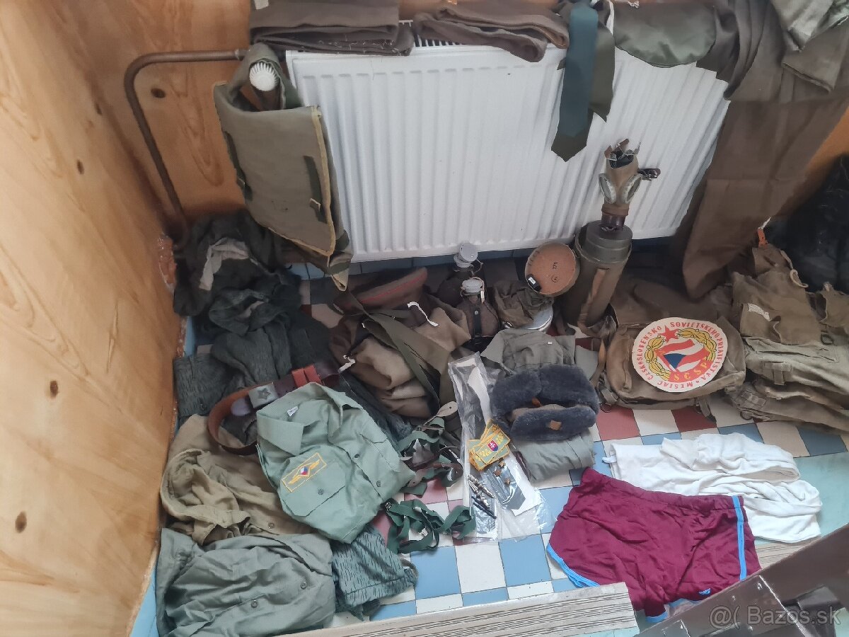 Nohavice, kravata a lodička. Nohavice 75 CM pás, 90 cm., lodičky 57 rok 1992 SR bez koženej vložky ( červené trenírky, lodička ČSSR a bundokošela a brigadírka predané) Hliníkový ešus komplet značený Meva1952. Na fotografiách nie je baret, ale nepremokavý povlak na brigadírku. Papierový krúžok na okno predaný.