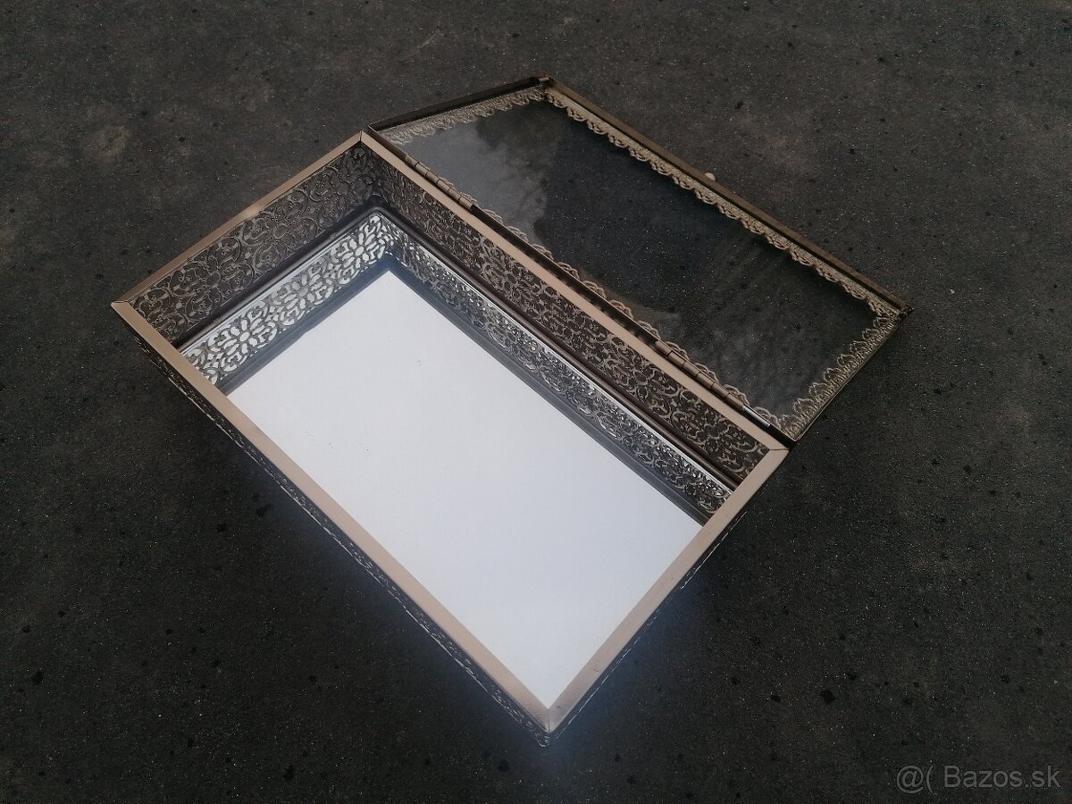 Predám túto zaujímavú kovovú šperkovnicu- vitrínu, materiál je teda železo- kov, z vrchnej časti je sklo, vnútri na spodnej časti je zrkadlo. Šperkovnica je v TOP stave, bez akéhokoľvek poškodenia. Rozmer 24,5cm x 14,5cm x výška 7cm. Cena 35€