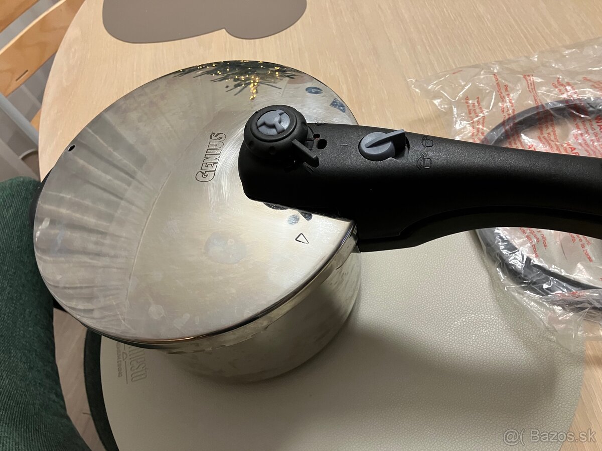 Predam tlakovy hrniec Genius, objem 4l, vhodny na vsetky typy varnych povrchov, aj do umyvacky riadu. Nahradna guma aj navod na pouzitie.