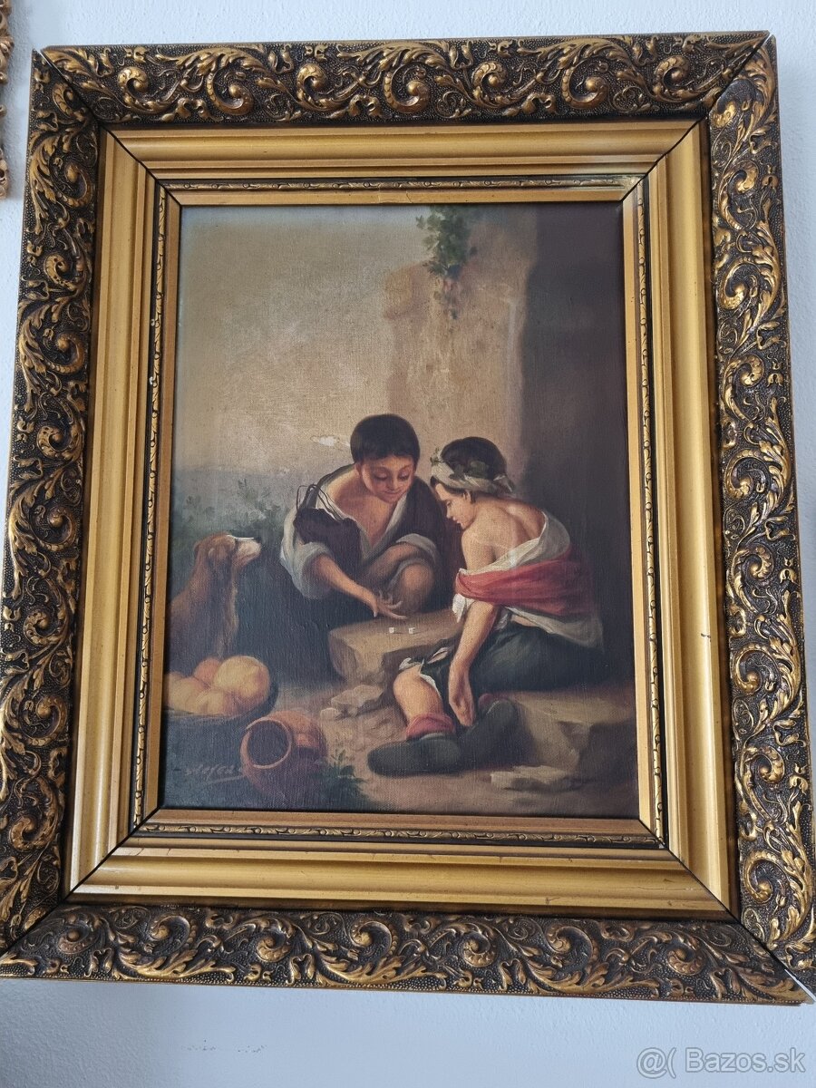 Ponúkam krásnu figurálnu olejomalbu zobrazujúcu dvoch chlapcov zaujatých hrou s kockami.