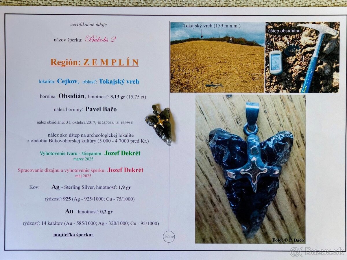 Šperk vyhotovil Jozef Dekrét /puncova značka JD/ z nálezu geológa a autora publikácií o výskytu zlatá na Slovensku Jana Bacu.
