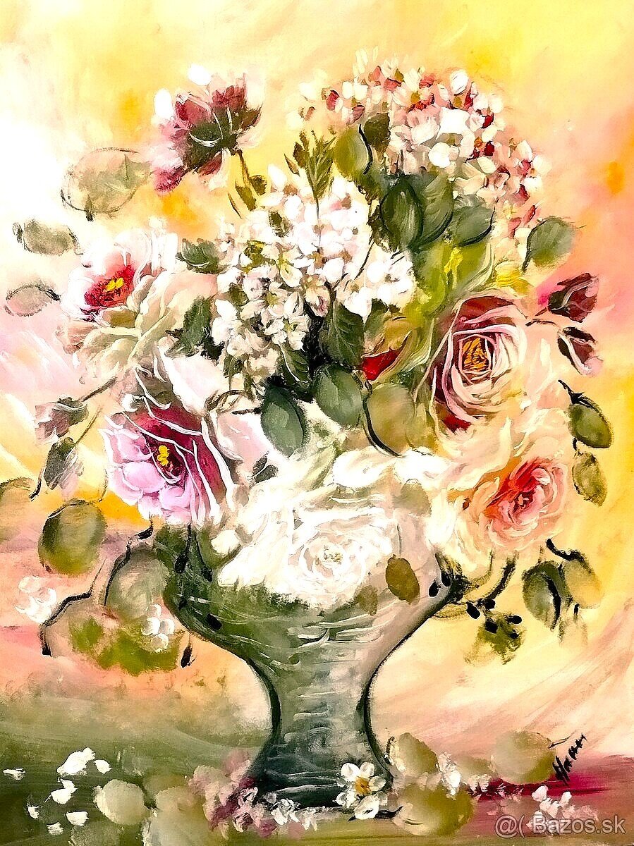 Olejomaľba ruží r.2025 - Kytica - [30.12. 2025]Ručne maľovaný obraz,olejonmaľba na sololite,rok 2025,rozmer 40x50cm,nezarámovaný a signovaná.