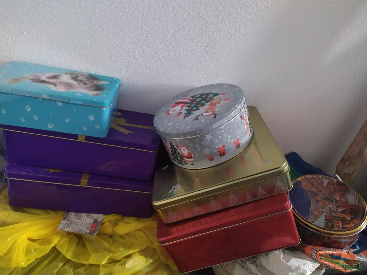 Plechové krabice - [13.11. 2025]Predám krásne plechové krabice, 5 ks+ 1 gratis, každá má rozmer - výška 11 CM, šírka 14 CM, hĺbka 9 CM. Osobný odber v Piešťanoch. Cena za všetko 20 €.