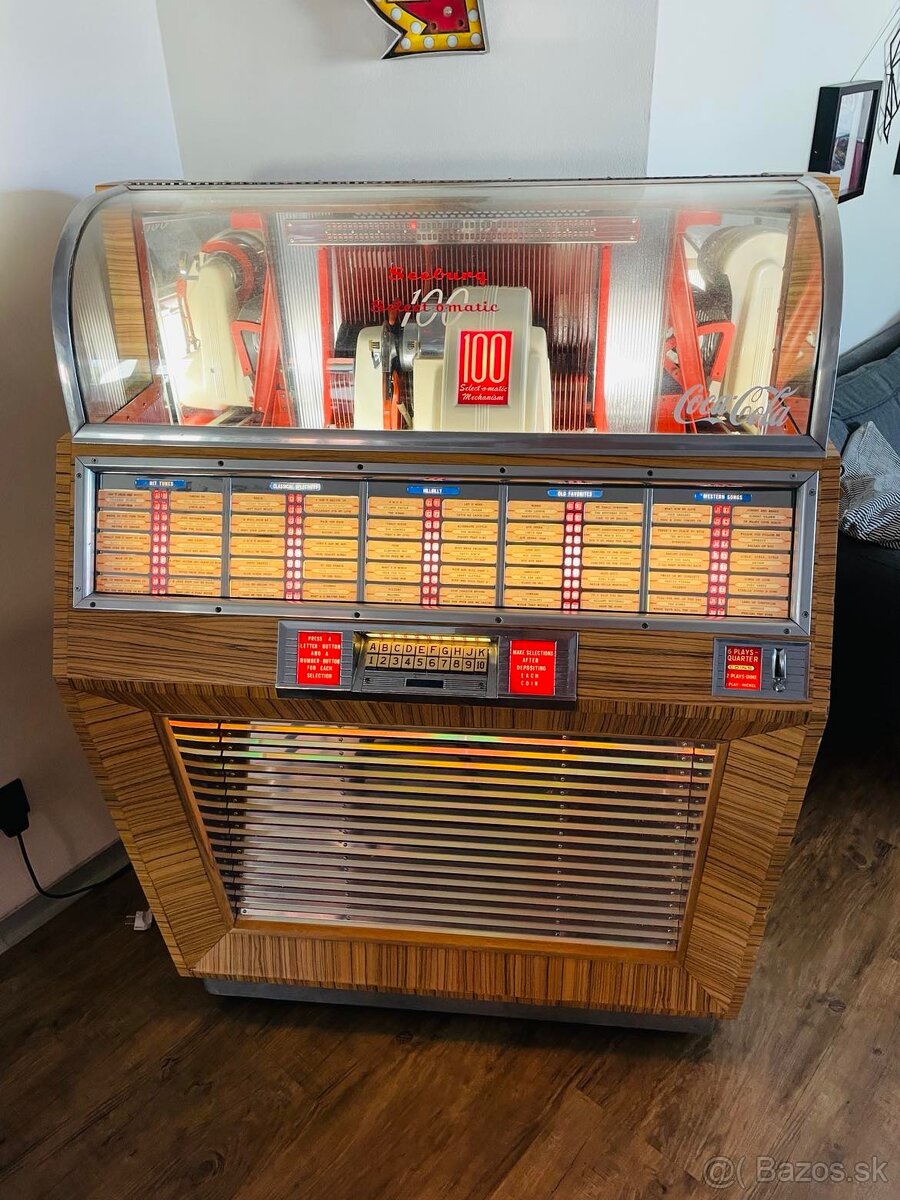 Krásný Jukebox po starší renovaci. Vše funkční, jen přehrávání jedné strany vinylů je potřeba seštělovat.