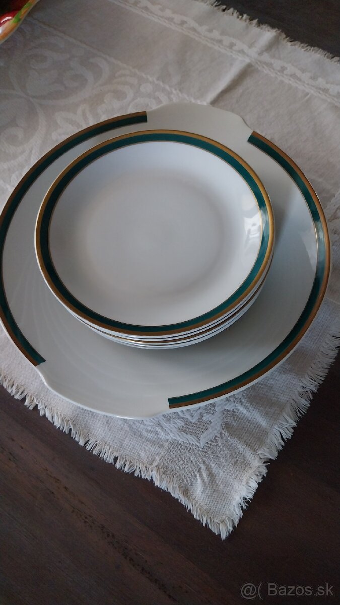 Sada pozostáva zo servírovacieho taniera a 6ks malých tanierikov. 2 male oťuky vid foto. Používané. Asi zo 70-tych rokov.