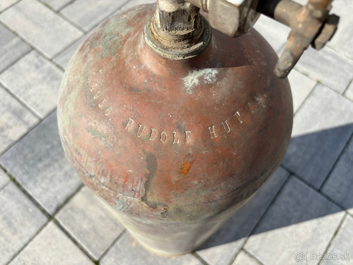 Predám medené tlakové nádoby používané v sódovkarenskom priemysle z čias 1.ČSR, Slovenského štátu a za Bolševika. Na plášti sú vyrazené symboly, čísla (objem a tlak) a punc 1.ČSR.