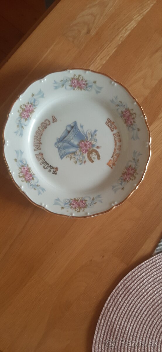 Predam porcelanový tanier k jubileu československej výroby 12 eur a drevenný podnos s poharikmi k jubileu 8 eur. Nepoškodené a nepoužívané