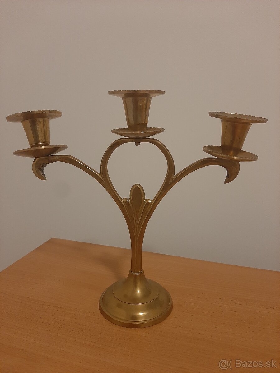 Trojramenný svietnik - [8.2. 2026]Predám pôvodný starší trojramenný svietnik v kombinácii mosadze a dreva.