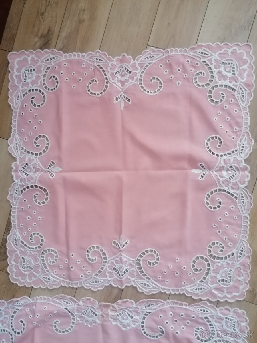 Predám obrus ručne vyšívaný krivou ihlou... Ružový s bielym olemovanim a bielou výšivkou. Rozmer 40x70..nepoužívaný...