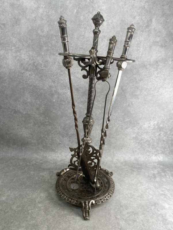 Súprava krbového náradia v secesnom liatinovom stojane lopatka,pinzeta , kutáč zdobené rukoväte , secesný držiak niklované prevedenie