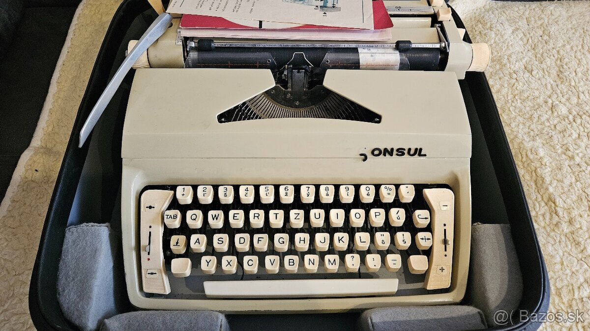Predám zachovalý písací stroj Consul v kufríku, cena 20 €.