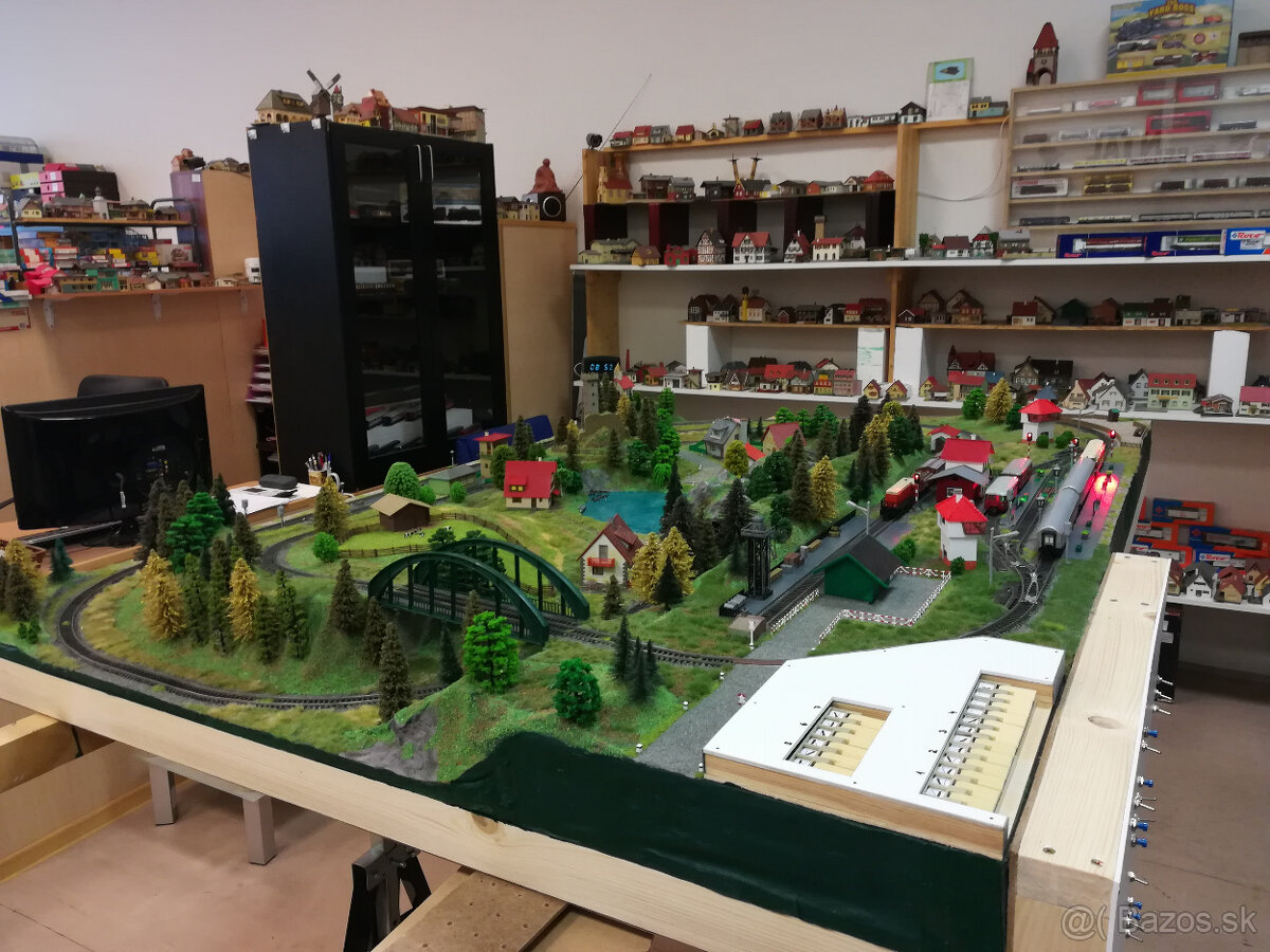 !PRODÁNO! Analogové kolejiště (možno přeinstalovat na digitální provoz souprav), kolejivo U profil. Kolejiště je částečně repasované, je obsluhováno z ovládacího pultu, který obsahuje ovládání elektromagnetických výhybek, světelných návěstidel s vazbou do kolejí, odstavných úseků trati a tří okruhů nočního osvětlení (domky + 2 nádraží). Součástí ceny nejsou vyobrazené vlakové soupravy a napájecí trfo. Vše je možno dokoupit.