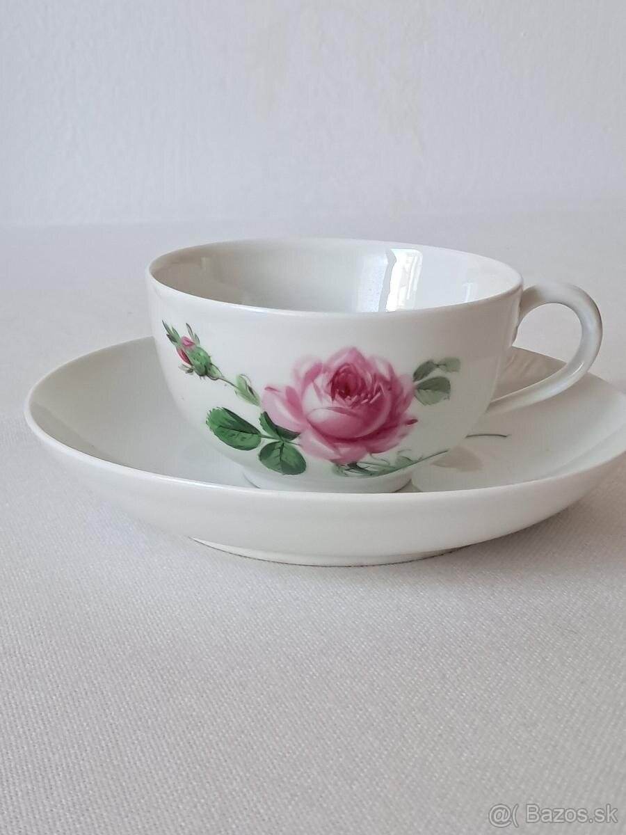 Míšeň, Meissen porcelánové šapo červená růže v dobrém a nepoškozeném stavu, šálek: výška 60 mm, průměr 100 mm, podšálek: průměr 160 mm, mám dva stejné šálky, sledujte i mé ostatní nabídky, platí do smazání inzerátu.