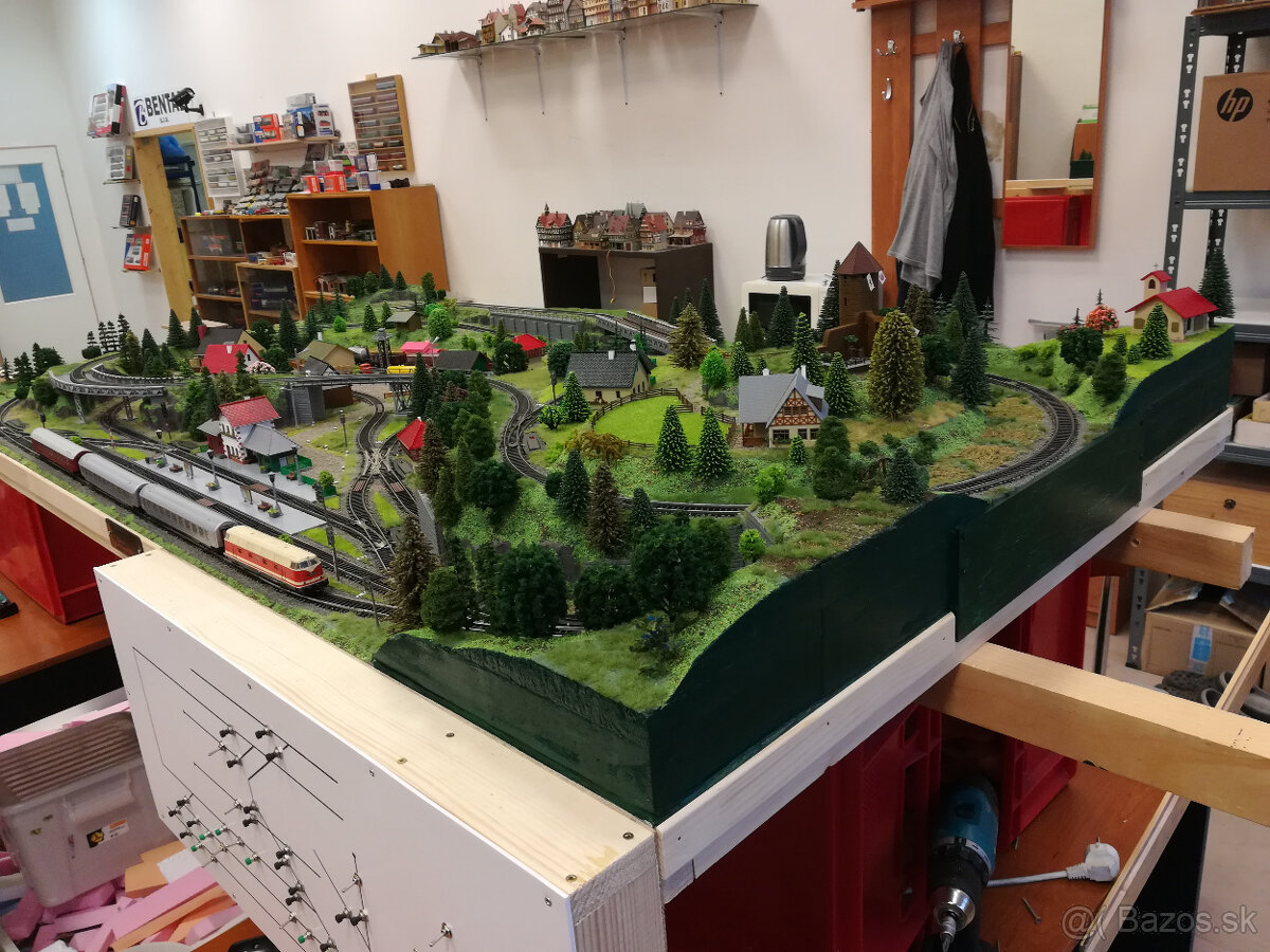 !PRODÁNO!(Můžete mít podobné, v případě zájmu volejte níže uvedené tel. číslo nebo pište na mail). Kolejiště je analogové (možno přeinstalovat pro digitální provoz souprav), má dva okruhy vzájemně propojené, ovládány jedním trafem, je možno provozovat dvě soupravy souběžně. Kolejiště je obsluhováno z ovládacího pultu, který obsahuje ovládání elektromagnetických výhybek, světelných návěstidel s vazbou do kolejí, odstavných úseků trati a dvou okruhů nočního osvětlení (domky, nádraží se zastávkou). Součástí ceny nejsou vyobrazené vlakové soupravy a napájecí trafo, Vše je možno dokoupit.