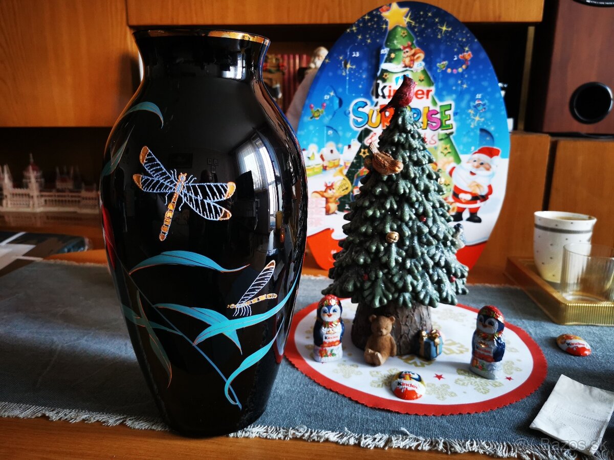 Predám retro vázu z 80-tych rokov. Váza je vyrobená z čierneho nepriesvitného skla. Maľba s vážkami je kvalitna odolná ako aj pozlátený náter Nezotiera sa ani pri umývaní, je to kvlatiny výrobok, žiadne poškodenie.