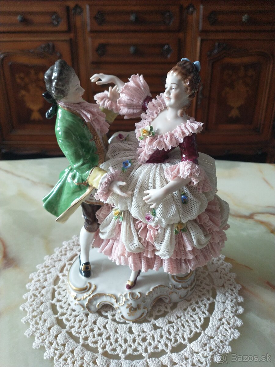 Predám krásnu sošku Volkstedt tancujúci pár Rokoko. Bohato nariasená porcelánová čipka posiata ručne modelovanými kvietkami značená modrou značkou Volkstedt vzhľadom na vek je v krásnom zachovalom stave kuk. Všetky moje inzeráty ďakujem