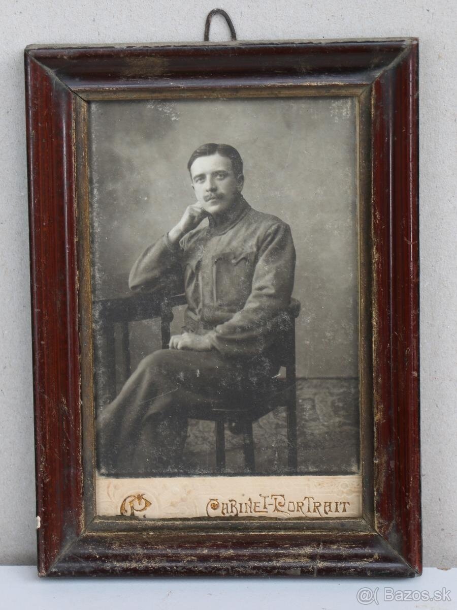 Fotografie vojaka I. sv. vojny v pôvodnom rámčeku so sklom. Veľkosť obrazu 19x14 cm. Vzadu na fotografií meno vojaka.