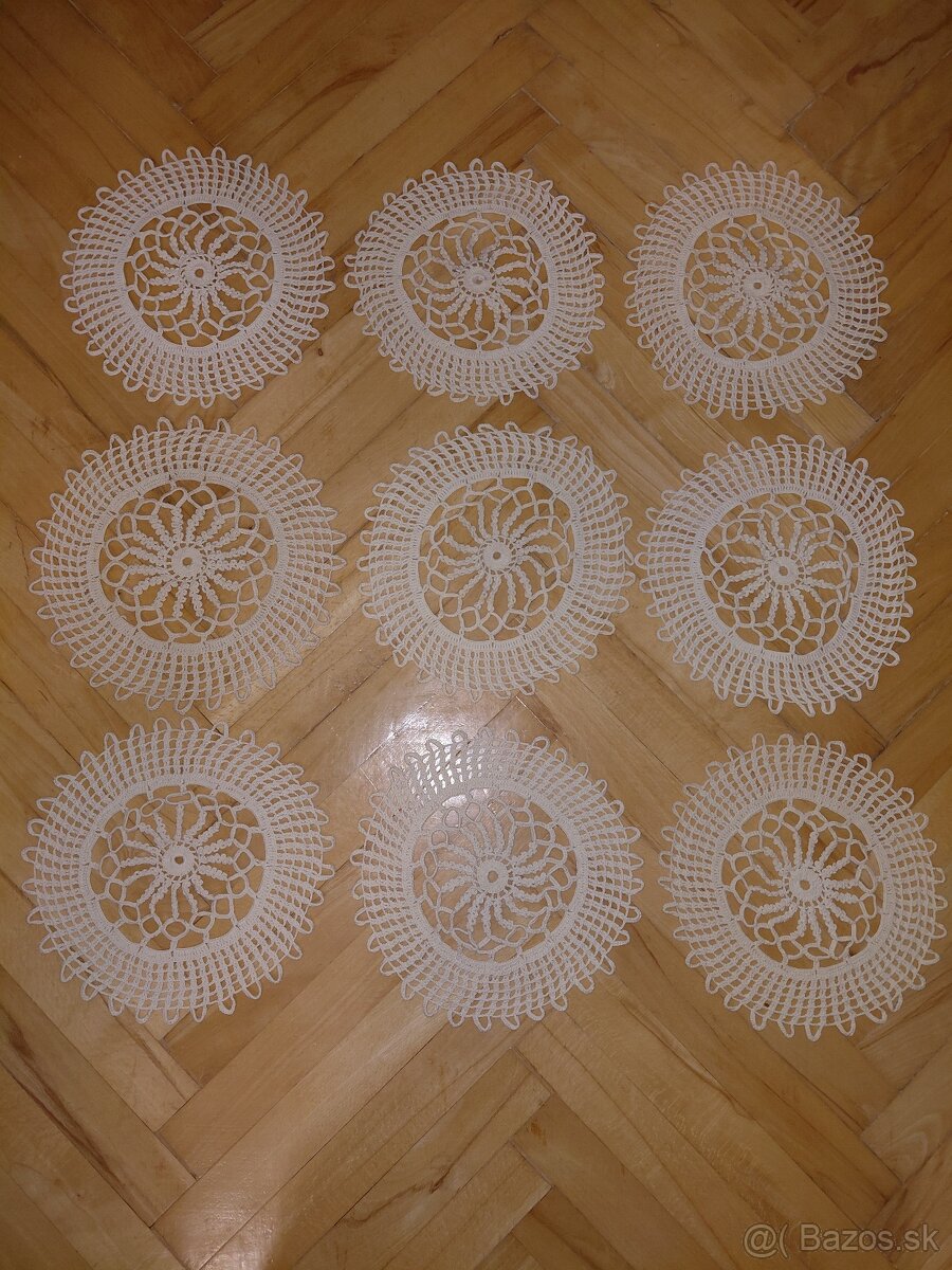 9 ks hačkovaných obrúskov o priemere 25cm. Cena spolu 10 eur.