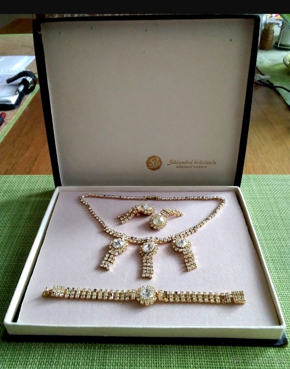 Starožitná súprava náhrdelník.,náramok a klipsove náušnice. Je to v pôvodnej krabičke