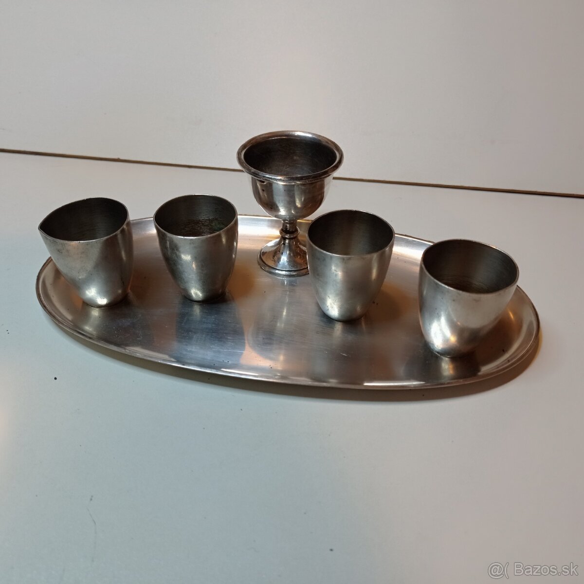 Alpaková ( značené) tácka plus 4 štamprlíky, likérky. Piaty pohárik je pravdepodobné cínová, alebo oceľová " miničaša"