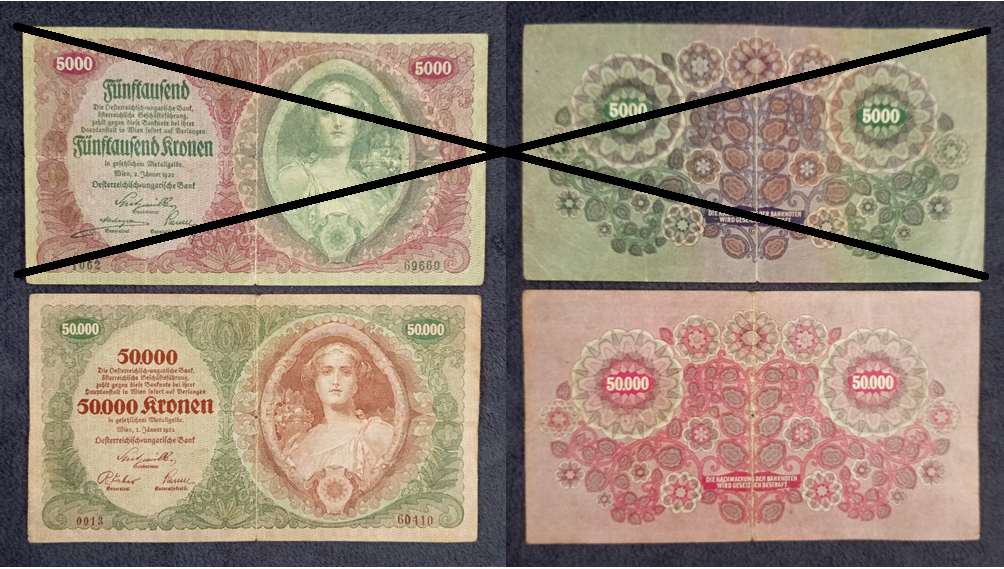 1.000 kronen 1922 – vrchné 4,-€/ks, spodné 2,-€/ks