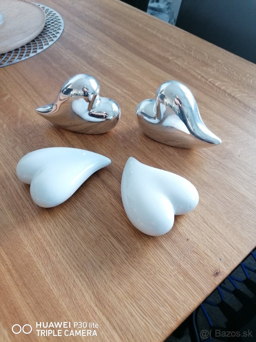 Bez poškodenia, len vystavené, 2 x biele srdiečko (ležiace), 2x strieborné srdiečko ( stojace), cena spolu 5 €