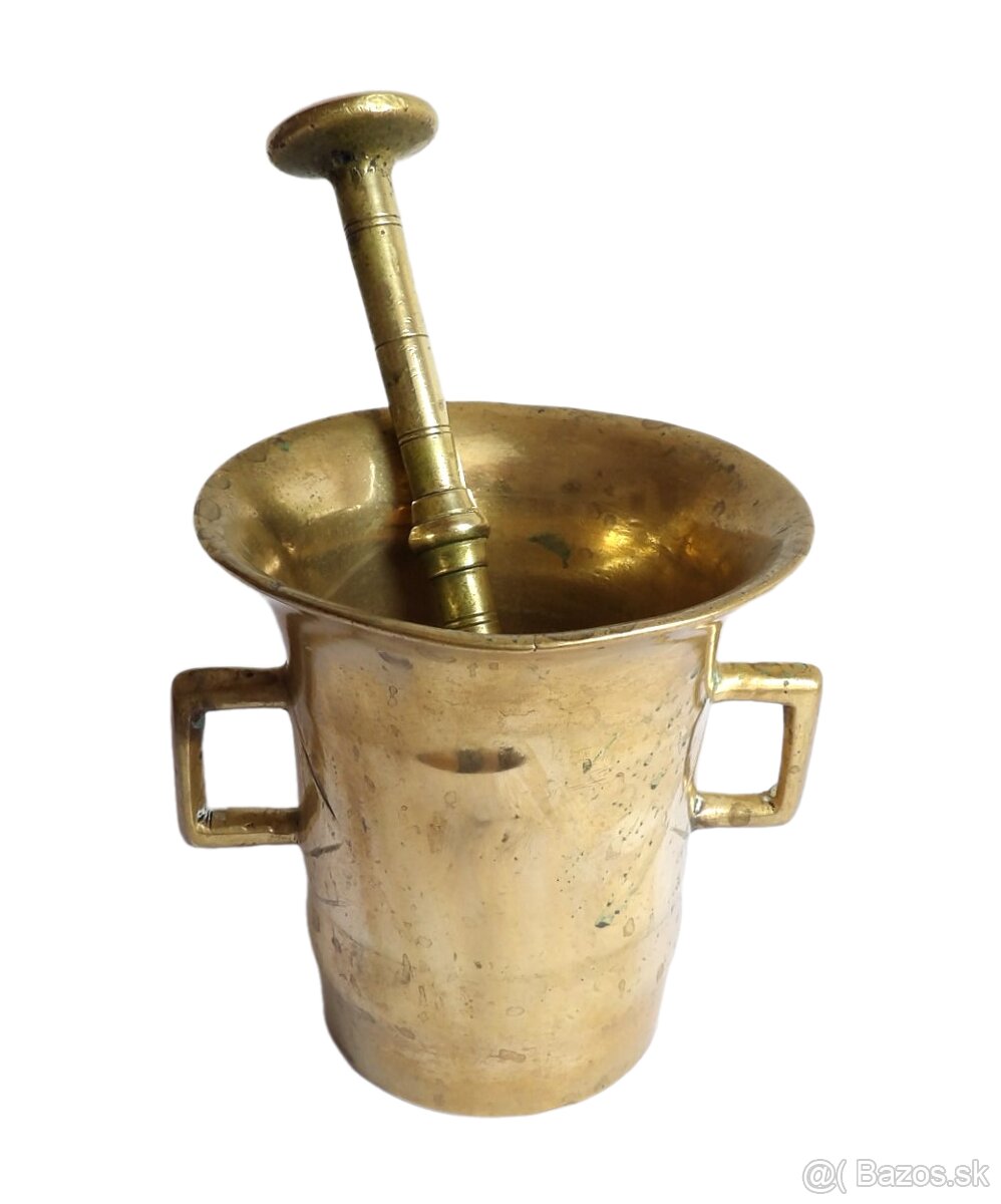 Starý mosazný hmoždíř s paličkou z konce 20 let 20. století, výška 12,5 cm, dobírka Packeta 5,-€.