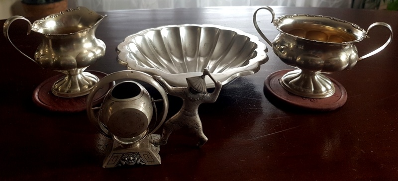 striebro, cajník, konvička, misa, lyžičky...BOLO