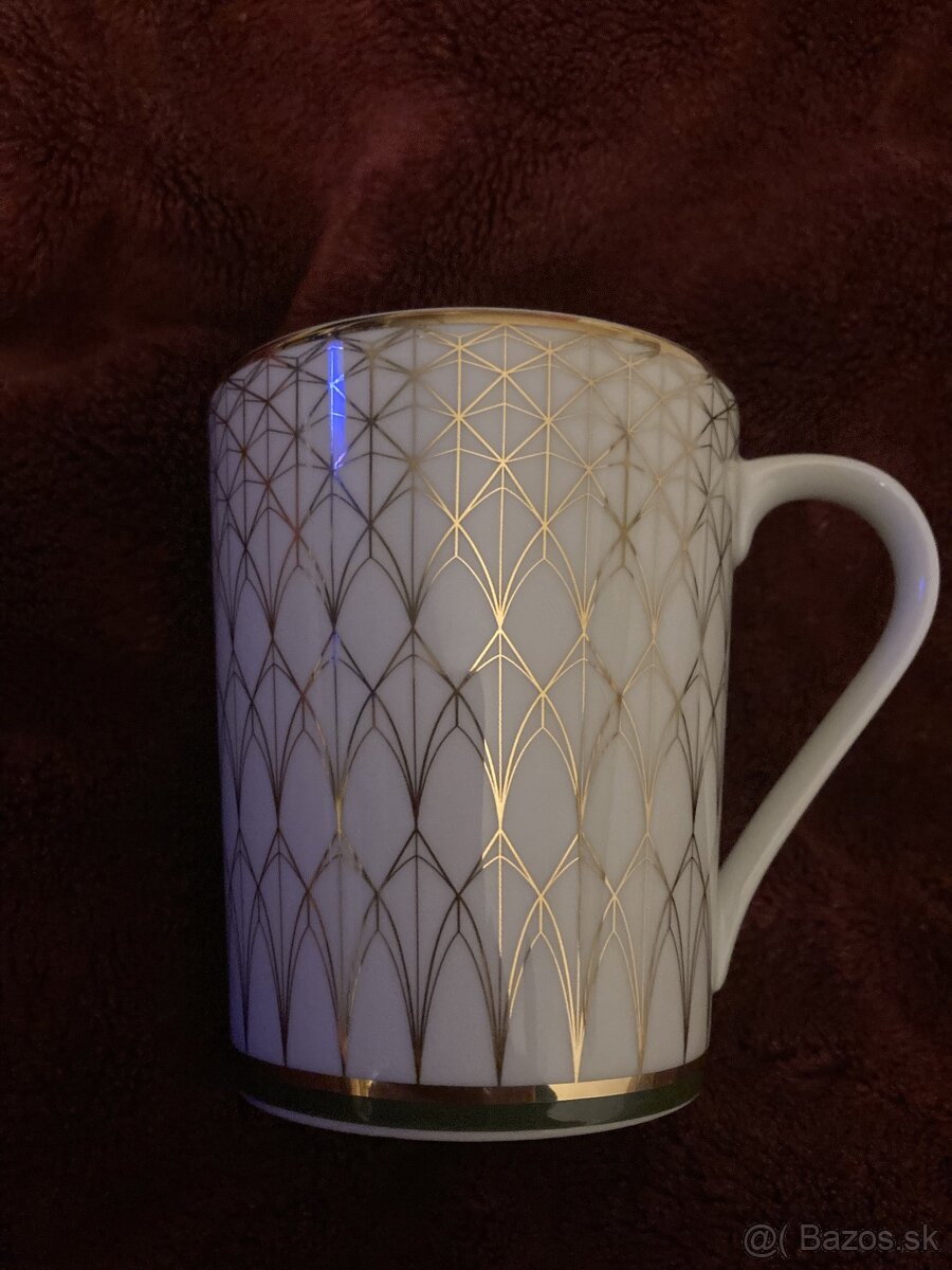 Predám nový hrnček z dielne renomovanej rakúskej značky Österreichische Werkstätten v pravej tyrkysovej farbe (dolný prúžok) a v zlatej farbe. Použitie: na čaj, kávu či kakao. V nadčasovom dizajne, s fascinujúcim geometrickým vzorom. Výška 11 cm, priemer 8 cm.