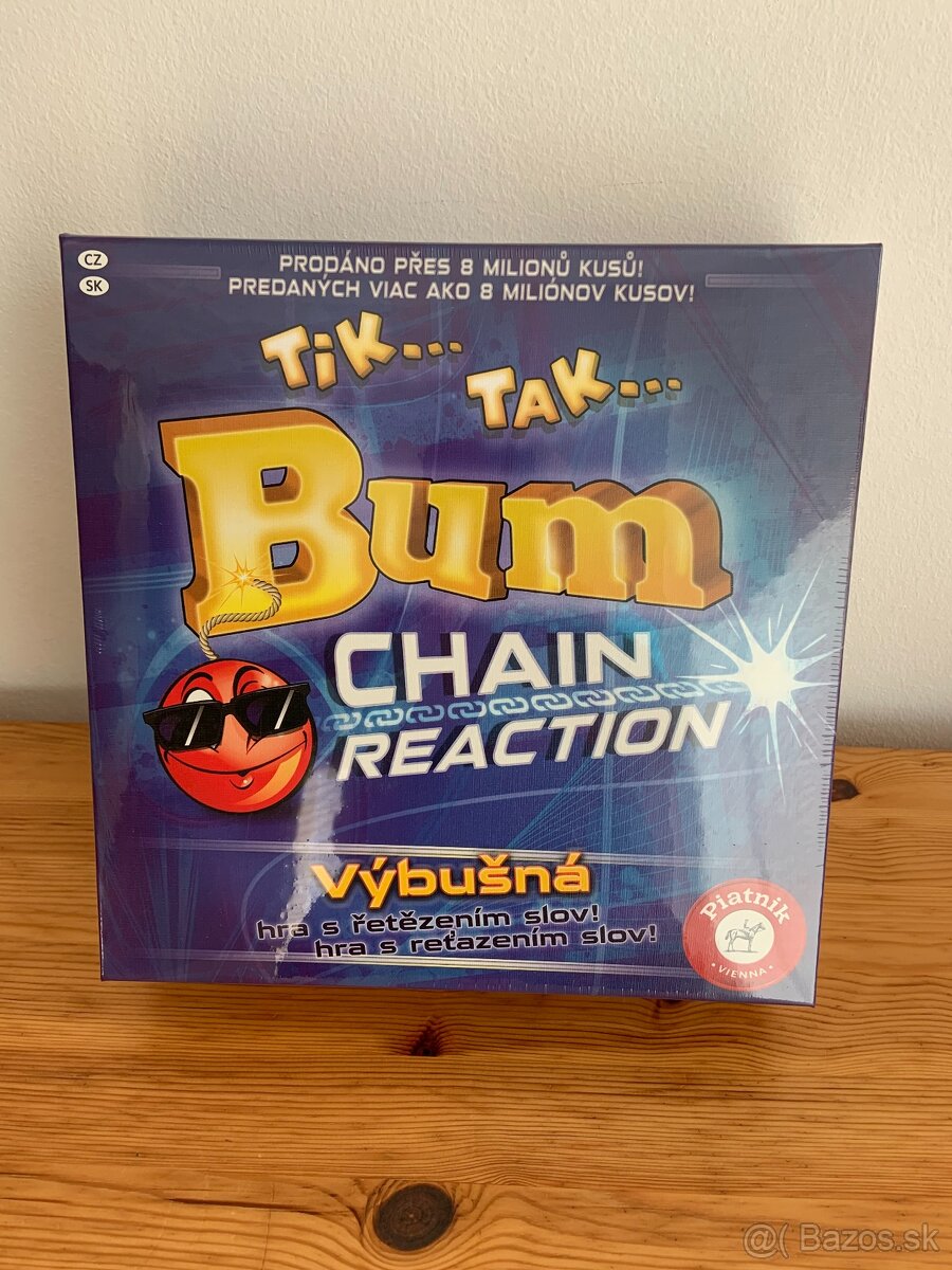 Predám úplne novú zábavnú a dynamickú spoločenskú hru s názvom BUM! Chain Reaction ideálna na párty, rodinné večery, atď.. Hra je originál zabalená vo fólii.