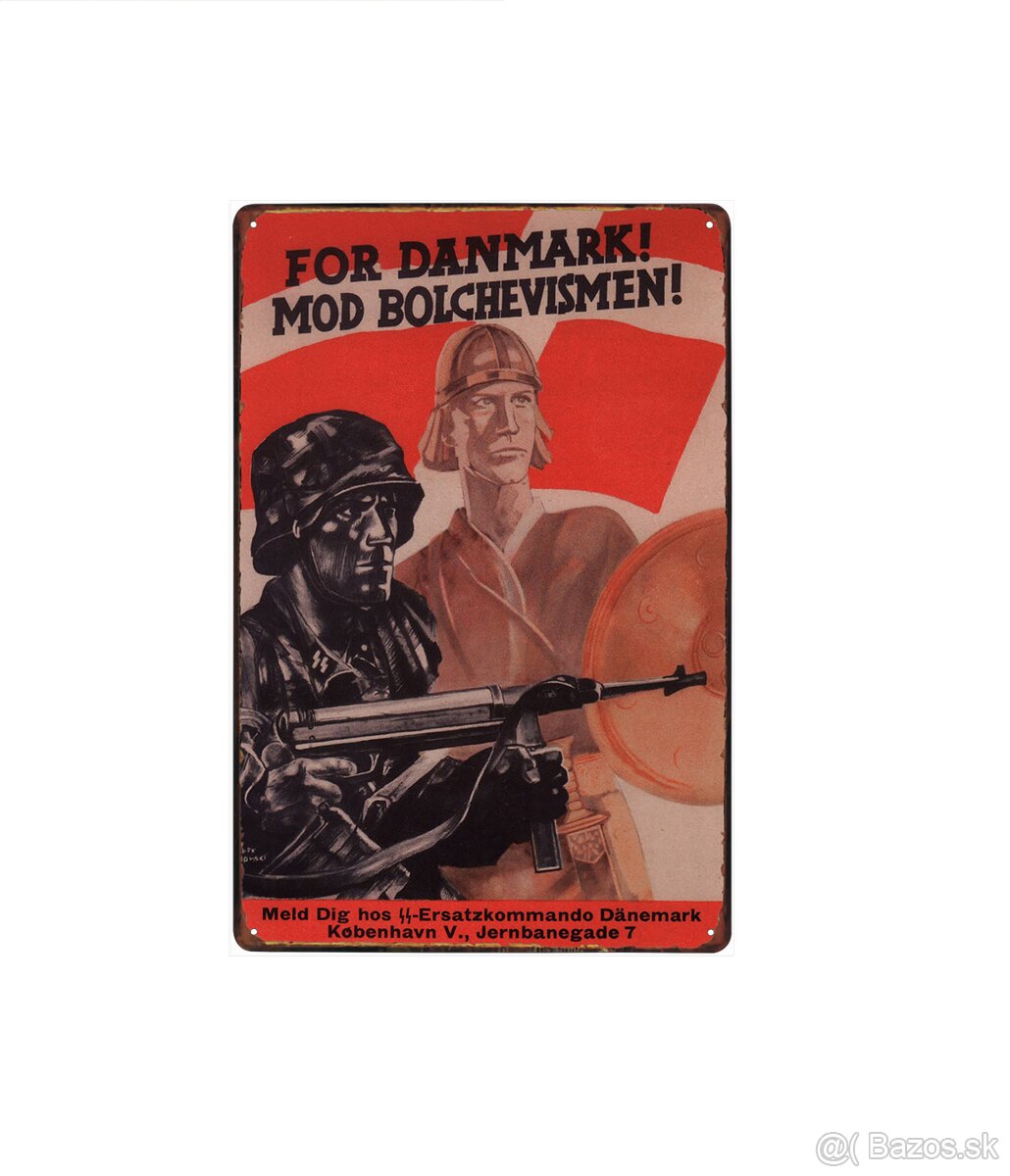 Dánský válečný propagandistický plakát ve formě nové plechové cedule.